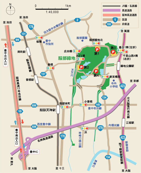 ・北大阪急行(御堂筋線直通)「緑地公園」駅から徒歩5分(東中央広場まで)